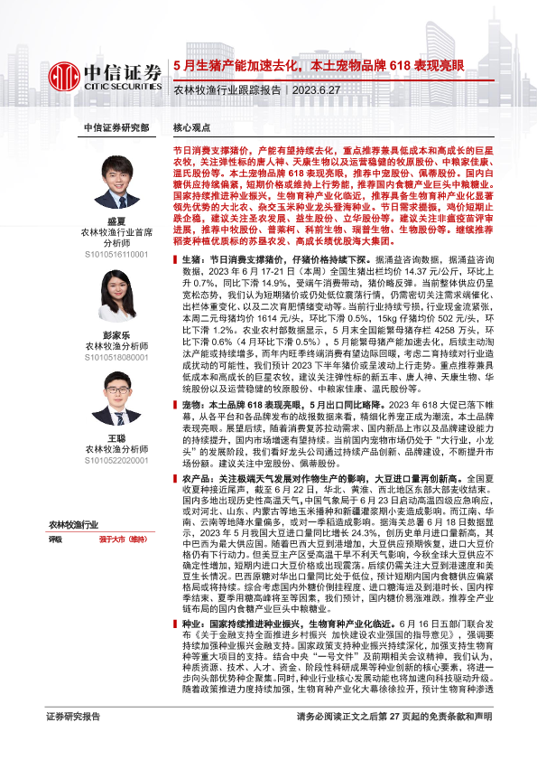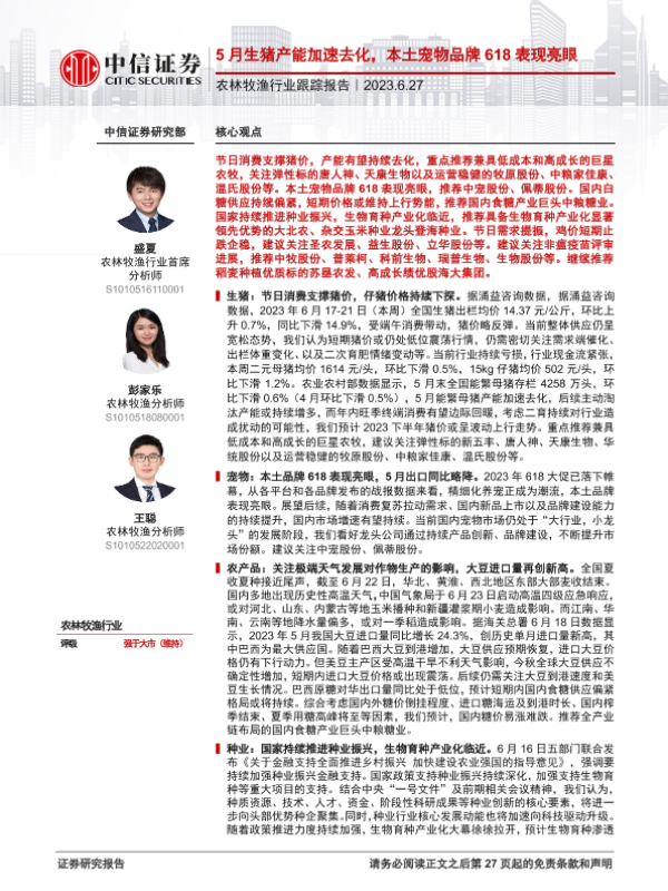 【中信证券】【20230627】农林牧渔行业跟踪报告:5月生猪产能加速去化,本土宠物品牌618表现亮眼-28页