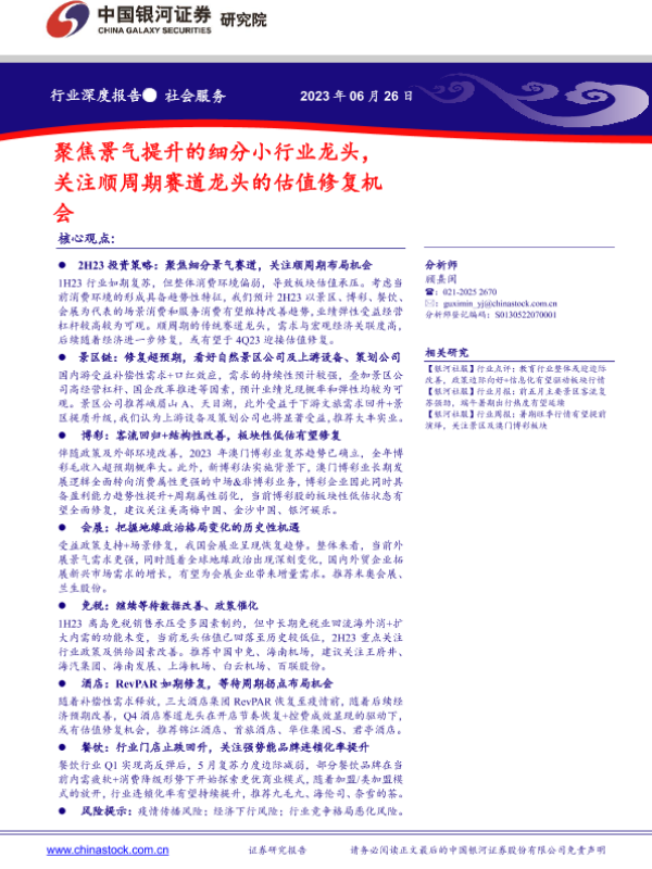 【银河证券】【20230626】社会服务行业深度报告:聚焦景气提升的细分小行业龙头,关注顺周期赛道龙头的估值修复机会-22页