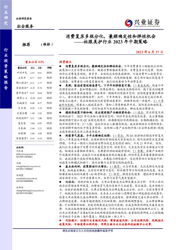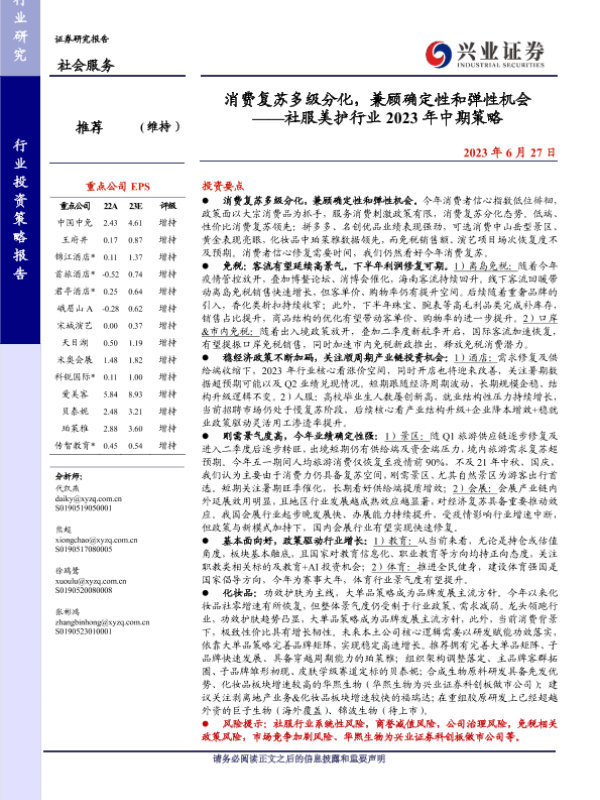 【兴业证券】【20230627】消费复苏多级分化,兼顾确定性和弹性机会 ——社服美护行业 2023年中期策略-43页