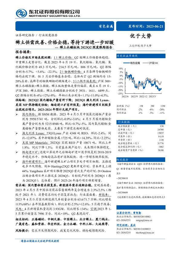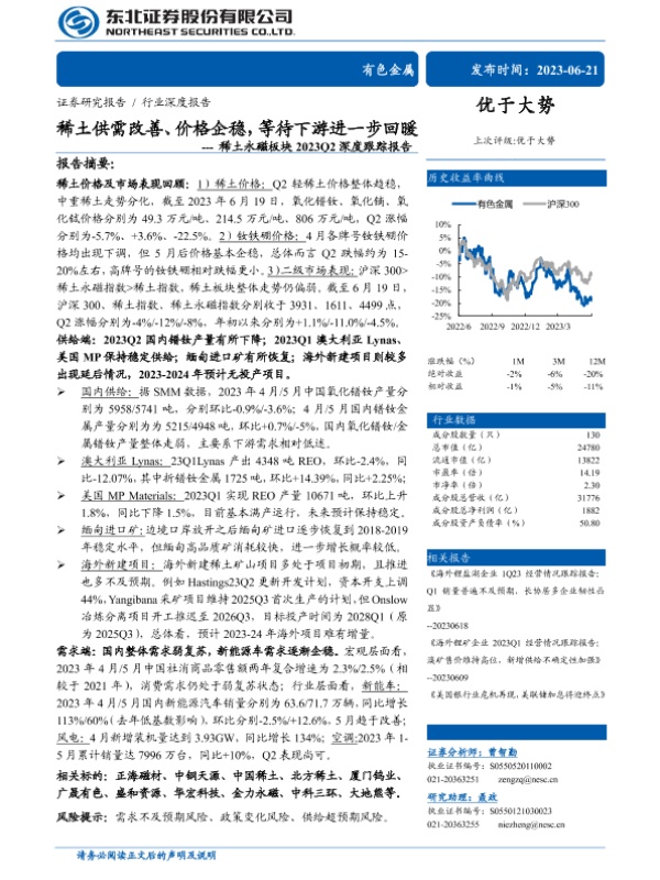 【东北证券】【20230621】有色金属行业稀土永磁板块2023Q2深度跟踪报告:稀土供需改善、价格企稳,等待下游进一步回暖-29页