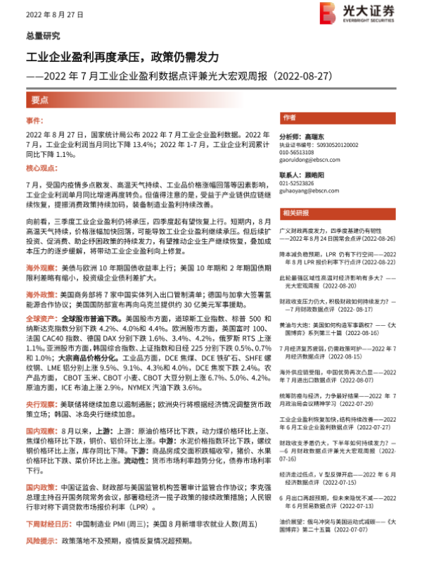 【光大证券】【20220827】2022年7月工业企业盈利数据点评兼光大宏观周报:工业企业盈利再度承压,政策仍需发力-20页