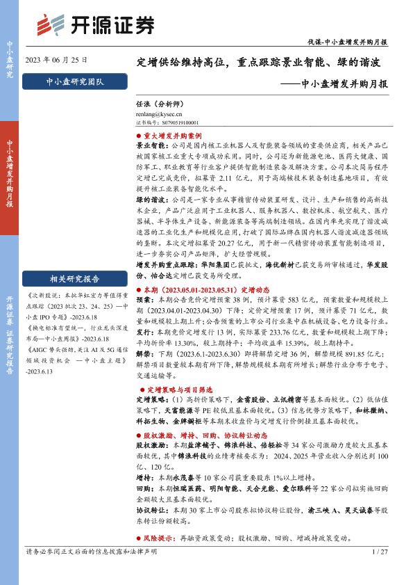【开源证券】【20230625】中小盘增发并购月报:定增供给维持高位,重点跟踪景业智能、绿的谐波-27页