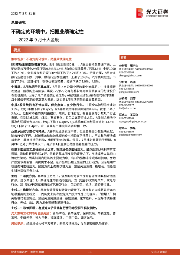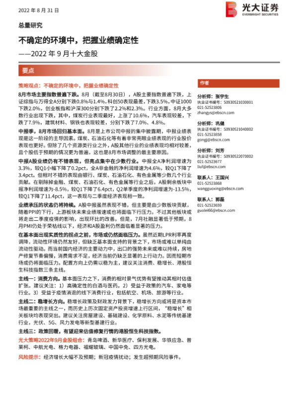 【光大证券】【20220831】2022年9月十大金股:不确定的环境中,把握业绩确定性-15页