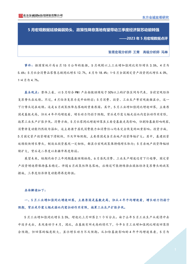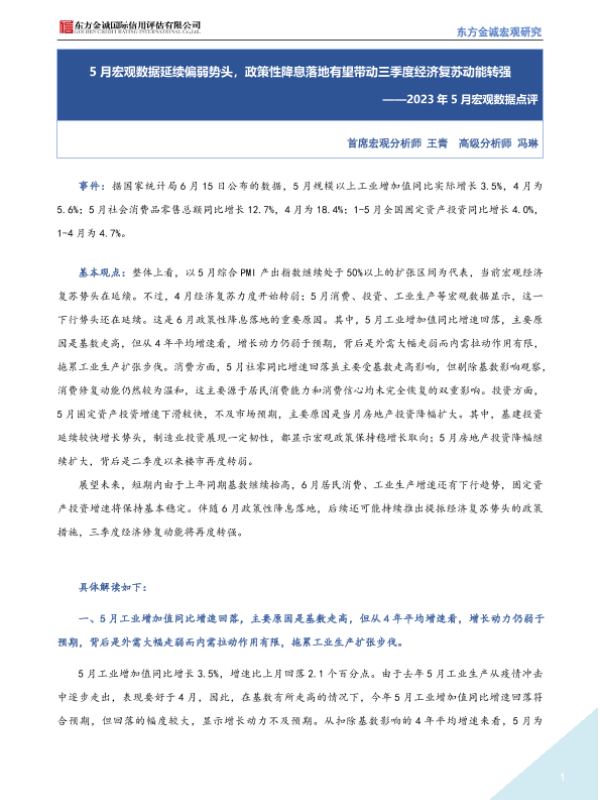 【东方金诚】【202306】东方金诚:5月宏观数据延续偏弱势头,政策性降息落地有望带动三季度经济复苏动能转强-6页