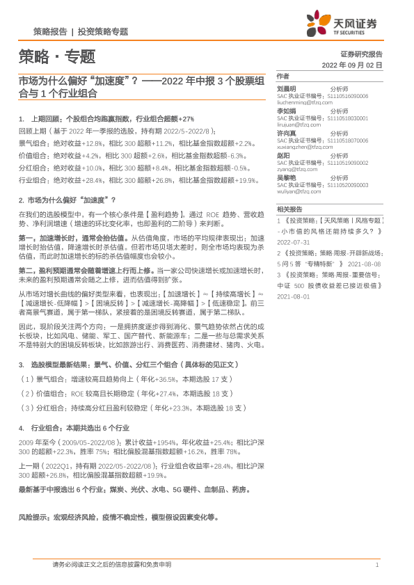 【天风证券】【20220902】2022年中报3个股票组合与1个行业组合:市场为什么偏好“加速度”?-16页