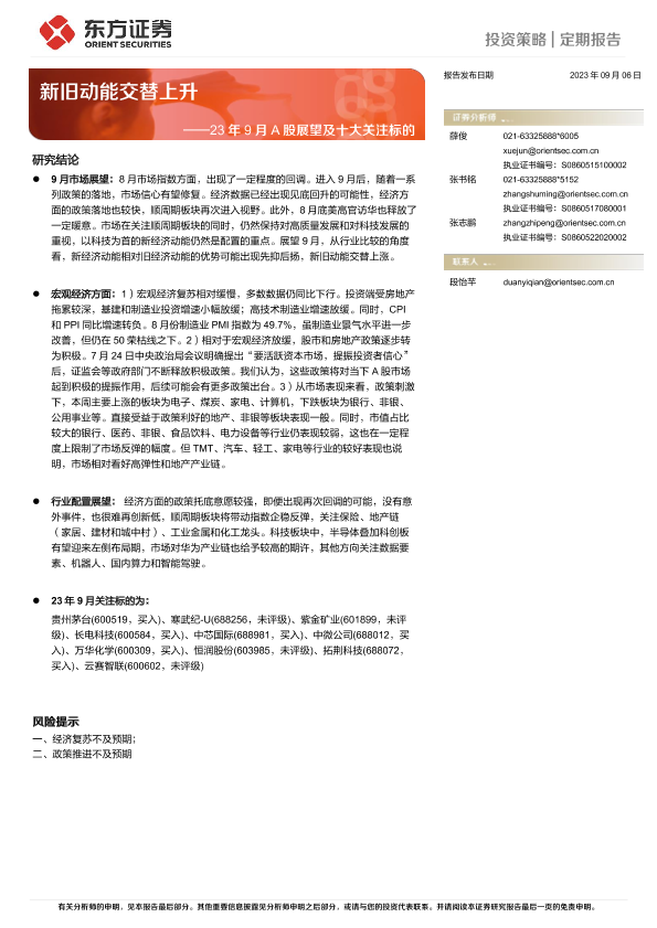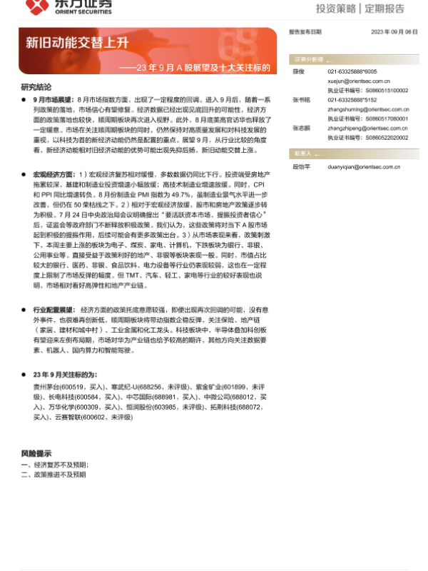 【东方证券】【20230906】23年9月A股展望及十大关注标的:新旧动能交替上升-19页