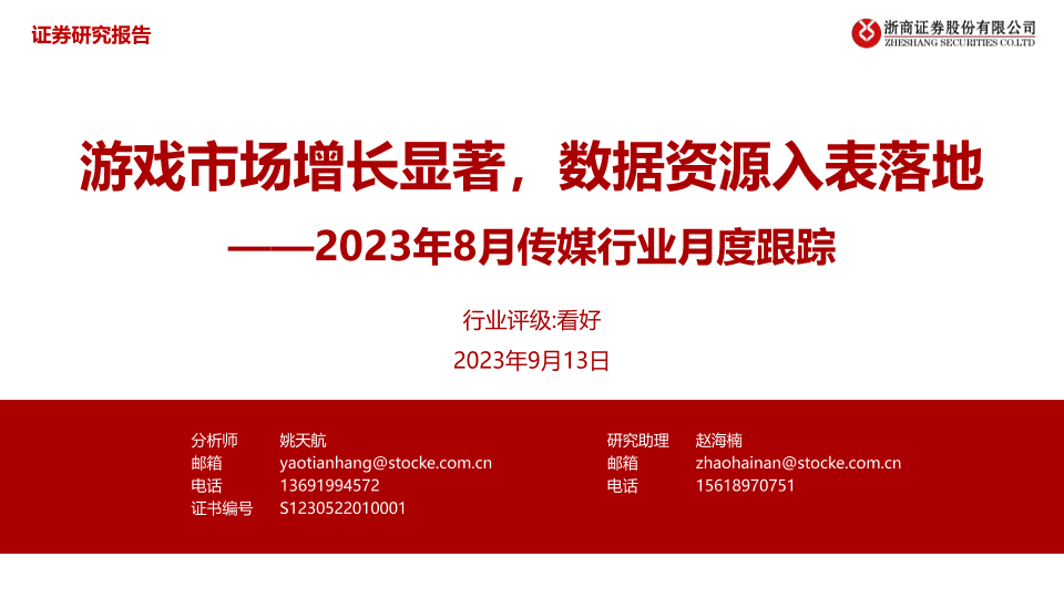 【浙商证券】【20230913】2023年8月传媒行业月度跟踪:游戏市场增长显著,数据资源入表落地-35页