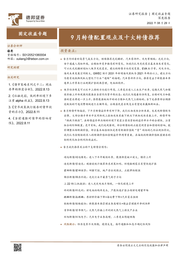 【德邦证券】【20220829】9月转债配置观点及十大转债推荐-24页