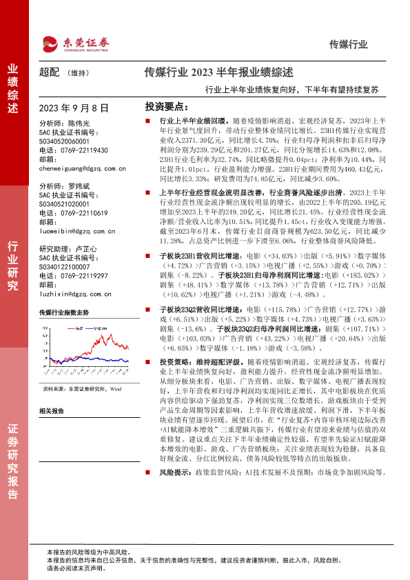 【东莞证券】【20230908】传媒行业2023半年报业绩综述:行业上半年业绩恢复向好,下半年有望持续复苏-33页