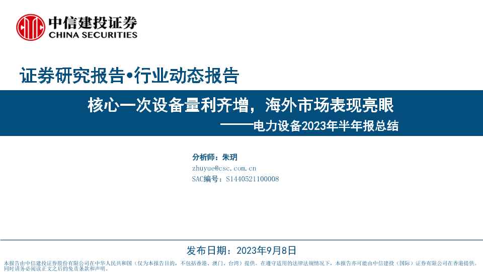 【中信建投证券】【20230908】电力设备行业2023年半年报总结:核心一次设备量利齐增,海外市场表现亮眼-33页