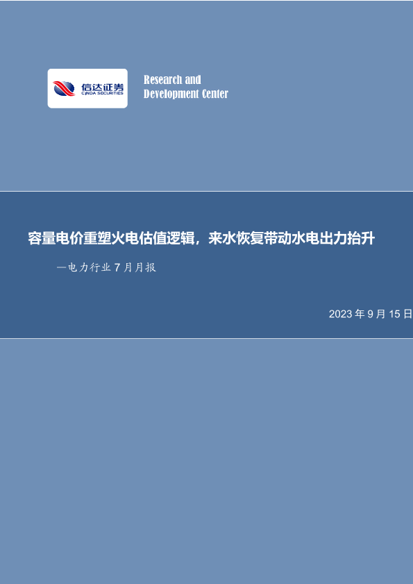 【信达证券】【20230915】电力行业7月月报:容量电价重塑火电估值逻辑,来水恢复带动水电出力抬升-28页