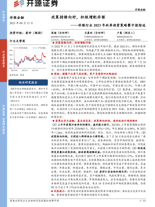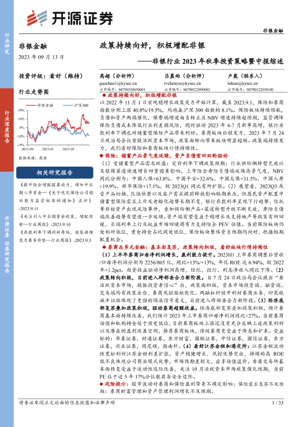 【开源证券】【20230913】非银行业2023年秋季投资策略暨中报综述:政策持续向好,积极增配非银-33页