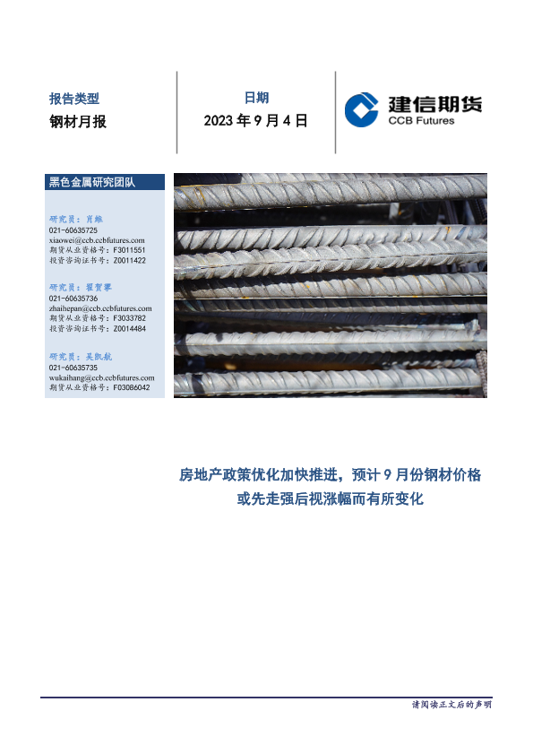 【建信期货】【20230904】钢材月报:房地产政策优化加快推进,预计9月份钢材价格或先走强后视涨幅而有所变化-17页