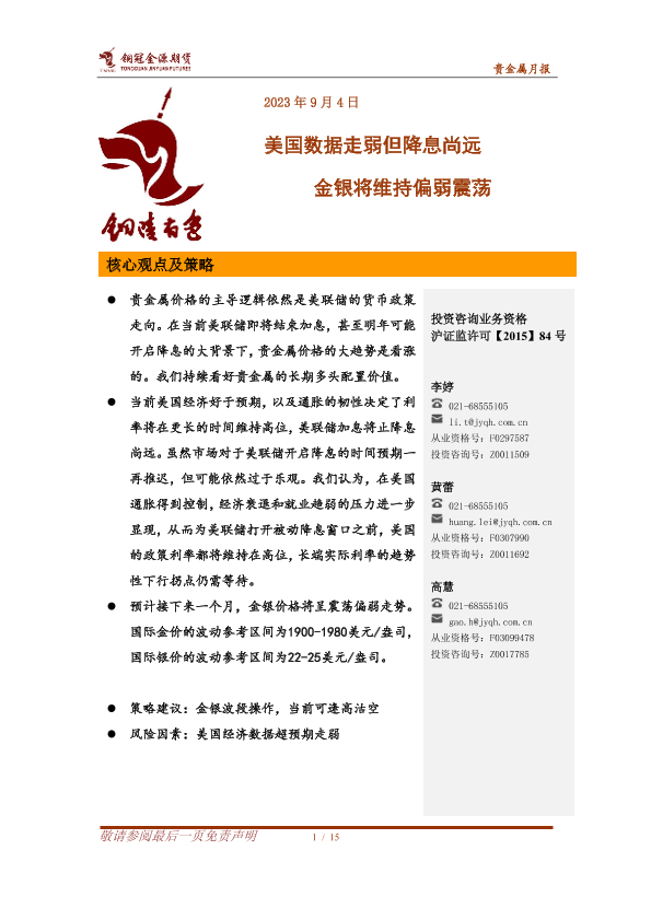 【铜冠金源期货】【20230904】贵金属月报:美国数据走弱但降息尚远,金银将维持偏弱震荡-15页