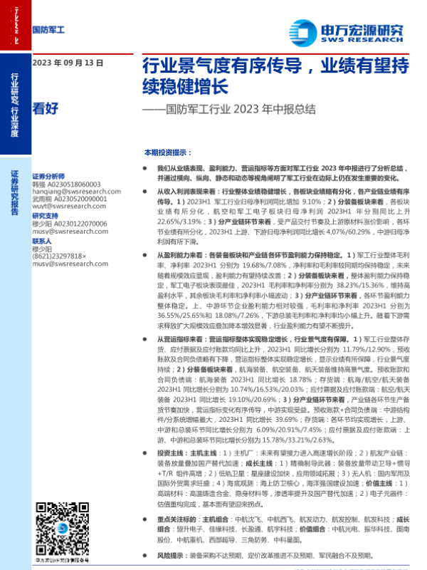 【申万宏源】【20230913】国防军工行业2023年中报总结:行业景气度有序传导,业绩有望持续稳健增长-31页