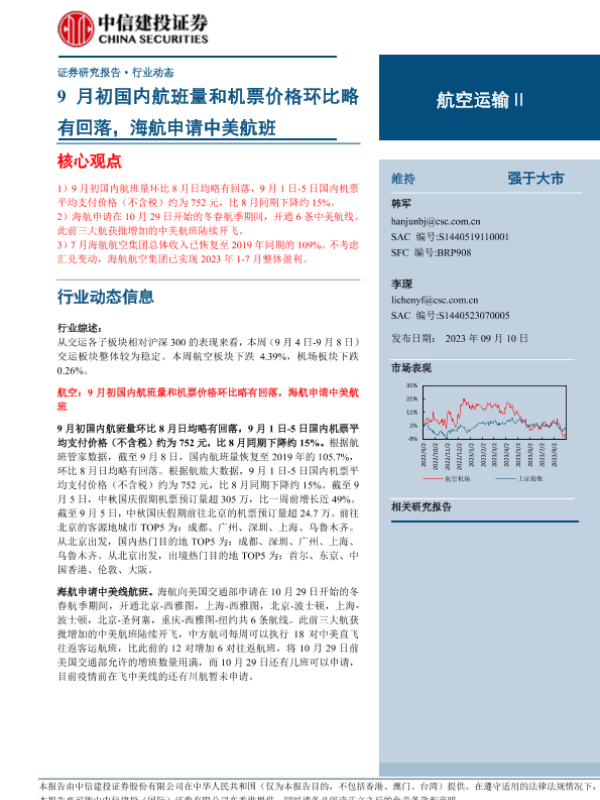 【中信建投证券】【20230910】航空运输行业:9月初国内航班量和机票价格环比略有回落,海航申请中美航班-25页
