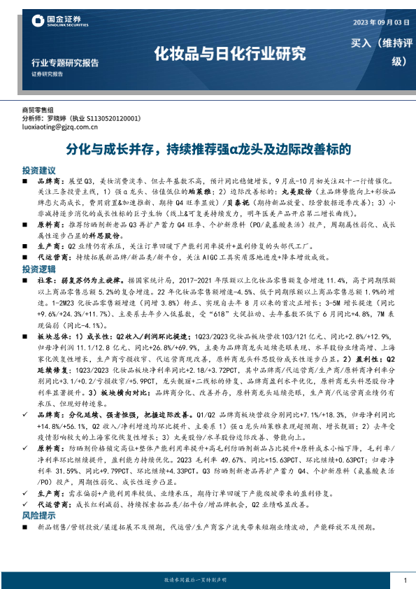 【国金证券】【20230903】化妆品与日化行业专题研究报告:分化与成长并存,持续推荐强α龙头及边际改善标的-16页