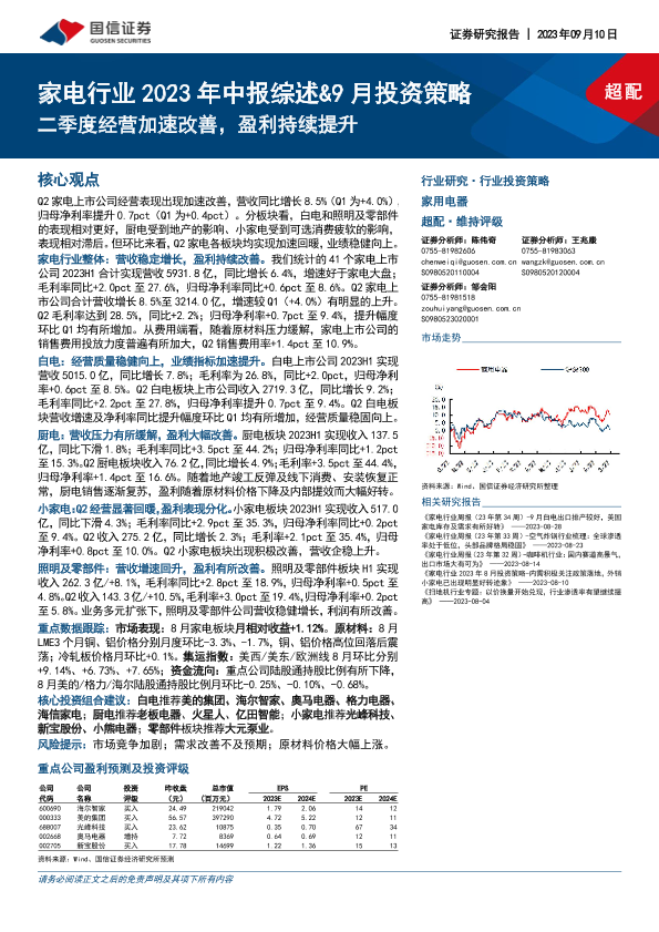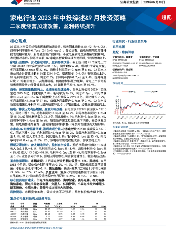【国信证券】【20230910】家电行业2023年中报综述&9月投资策略:二季度经营加速改善,盈利持续提升-23页