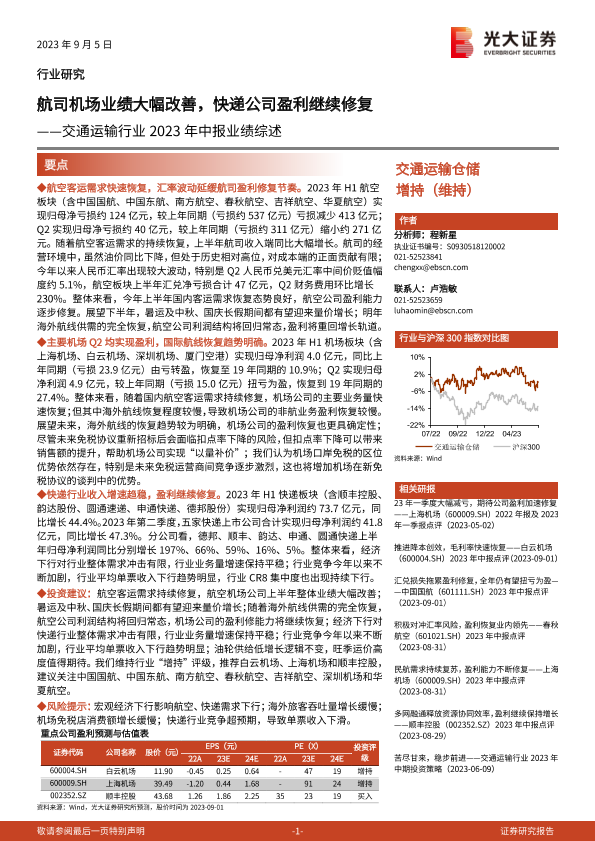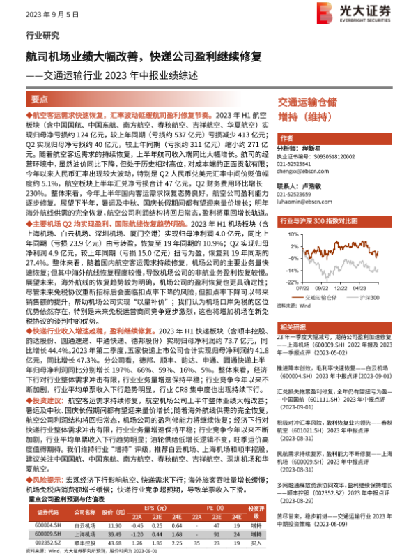 【光大证券】【20230905】交通运输行业2023年中报业绩综述:航司机场业绩大幅改善,快递公司盈利继续修复-16页