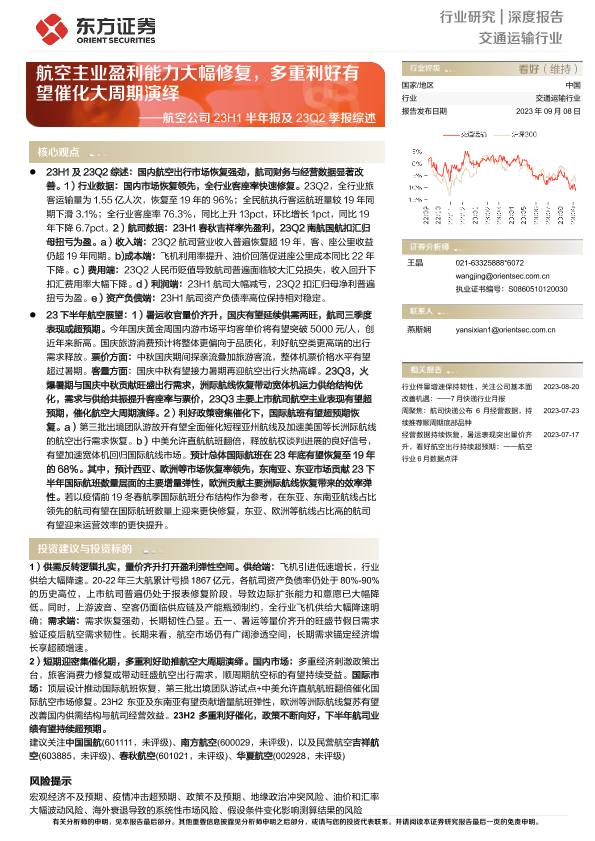 【东方证券】【20230908】交通运输行业航空公司23H1半年报及23Q2季报综述:航空主业盈利能力大幅修复,多重利好有望催化大周期演绎-29页