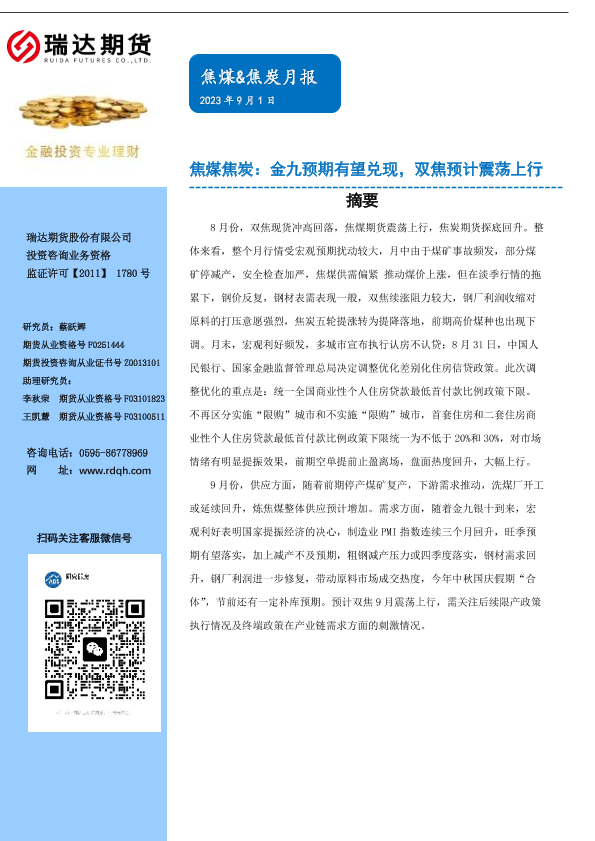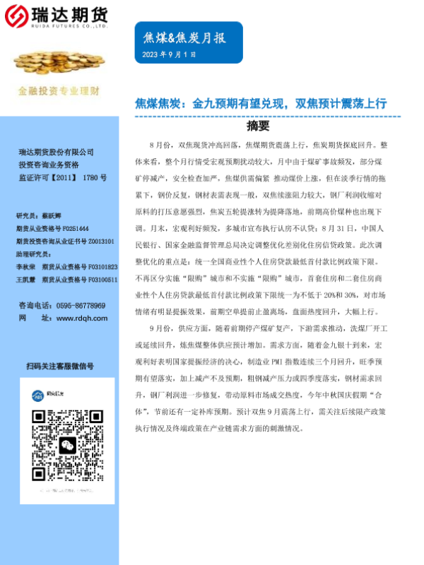 【瑞达期货】【20230901】焦煤&焦炭月报:金九预期有望兑现,双焦预计震荡上行-17页