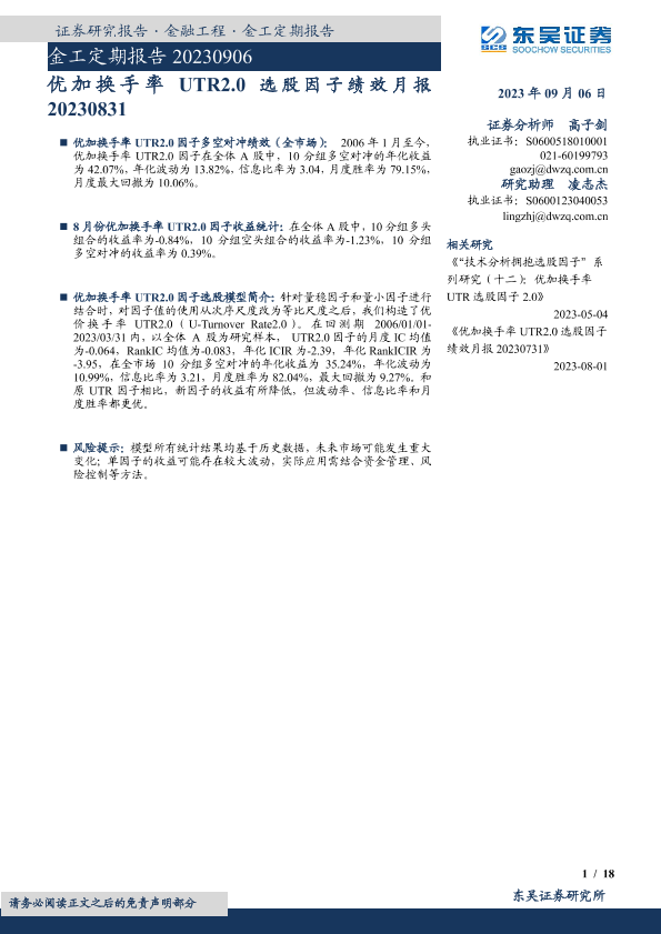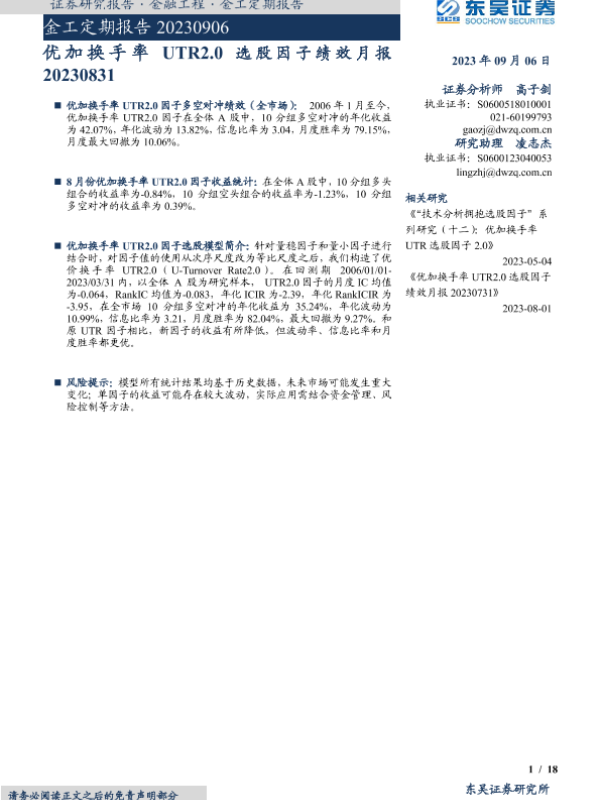 【东吴证券】【20230906】金工定期报告:优加换手率UTR2.0选股因子绩效月报20230831-20230906-18页
