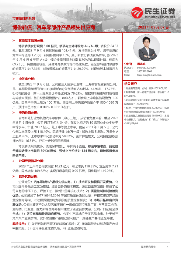 【民生证券】【20230907】可转债打新系列:博俊转债,汽车零部件产品领先供应商-15页