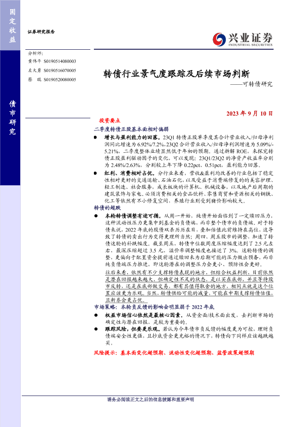 【兴业证券】【20230910】转债行业景气度跟踪及后续市场判断——可转债研究-23页