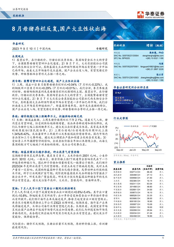 【华泰证券】【20230910】农林牧渔行业专题研究:8月母猪存栏反复,国产大豆性状出海-27页