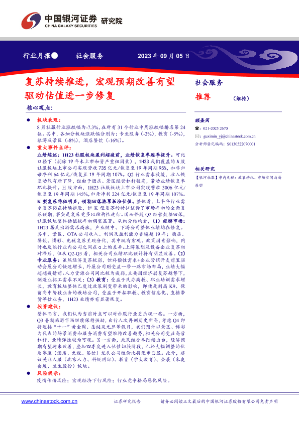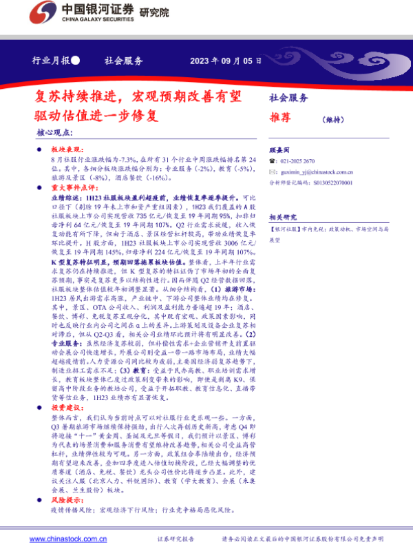 【银河证券】【20230905】社会服务行业月报:复苏持续推进,宏观预期改善有望驱动估值进一步修复-16页