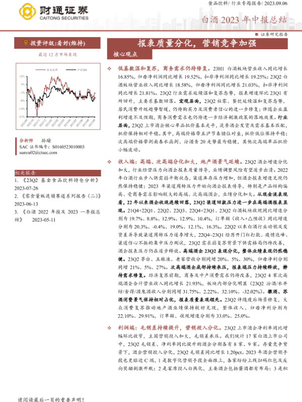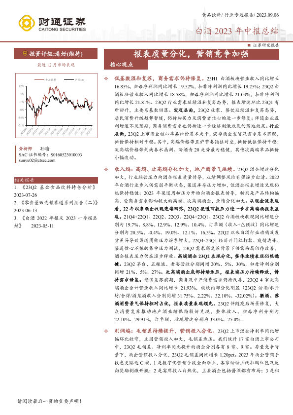【财通证券】【20230906】食品饮料行业白酒2023年中报总结:报表质量分化,营销竞争加强-18页