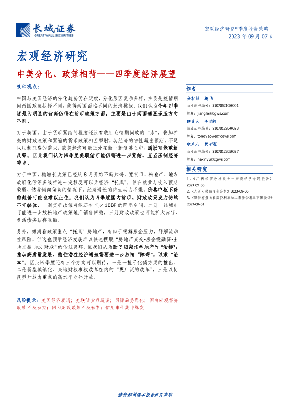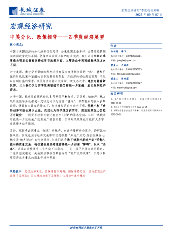 【长城证券】【20230907】四季度经济展望:中美分化、政策相背-21页