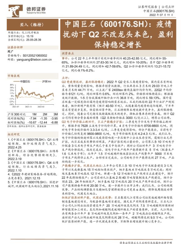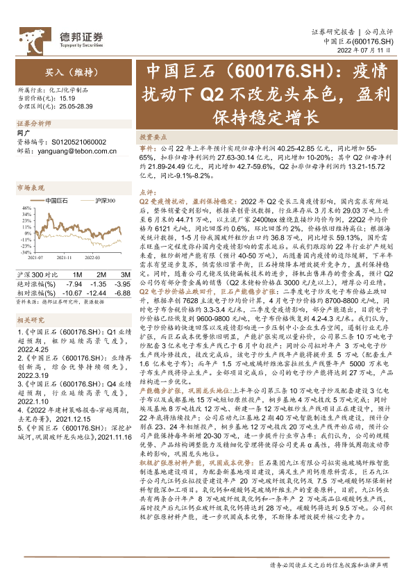 【德邦证券】【20220711】中国巨石(600176.SH):疫情扰动下Q2不改龙头本色,盈利保持稳定增长-4页
