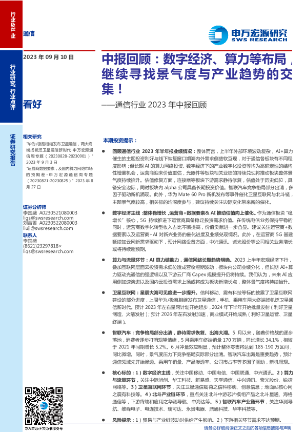 【申万宏源】【20230910】通信行业2023年中报回顾:中报回顾,数字经济、算力等布局,继续寻找景气度与产业趋势的交集!-23页