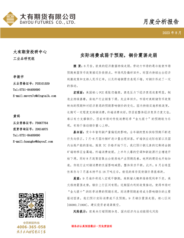 【大有期货】【20230904】铜月度分析报告:实际消费或弱于预期,铜价震荡走弱-17页