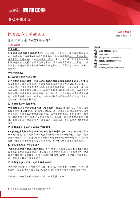 【西部证券】【20230911】行业比较月报(2023年9月):探索经济复苏的成色-27页