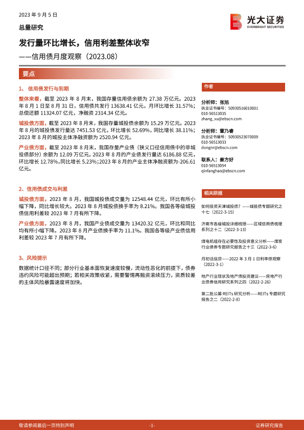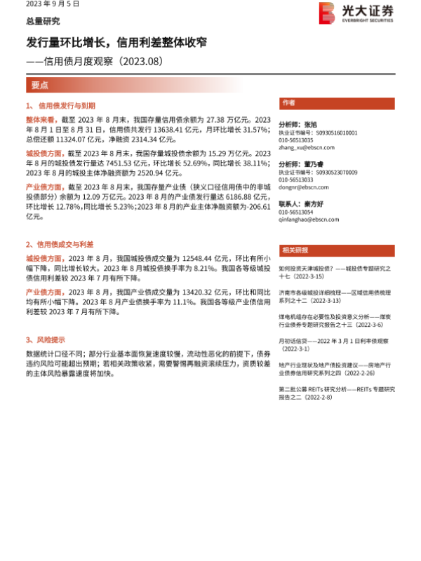 【光大证券】【20230905】信用债月度观察:发行量环比增长,信用利差整体收窄-16页