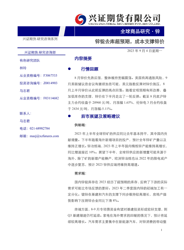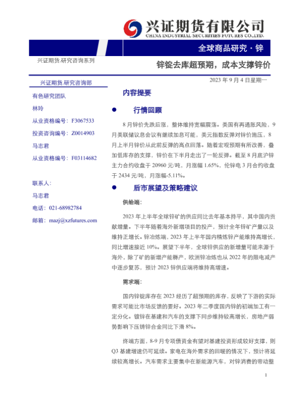 【兴证期货】【20230904】锌月度报告:锌锭去库超预期,成本支撑锌价-17页