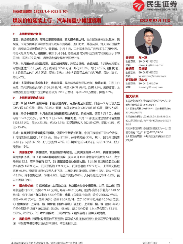 【民生证券】【20230912】行业信息跟踪:煤炭价格延续上行,汽车销量小幅超预期-30页