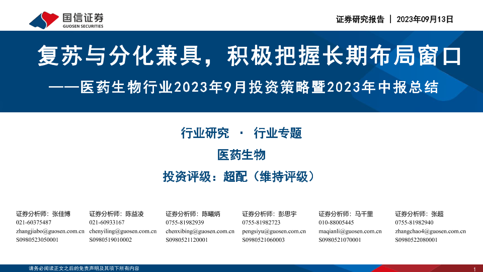 【国信证券】【20230913】医药生物行业2023年9月投资策略暨2023年中报总结:复苏与分化兼具,积极把握长期布局窗口-76页