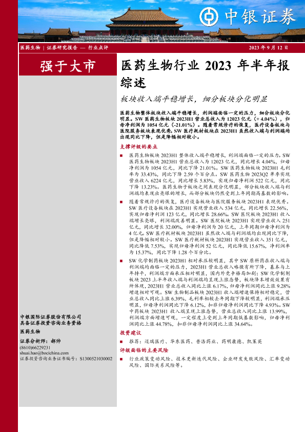 【中银证券】【20230912】医药生物行业2023年半年报综述:板块收入端平稳增长,细分板块分化明显-27页