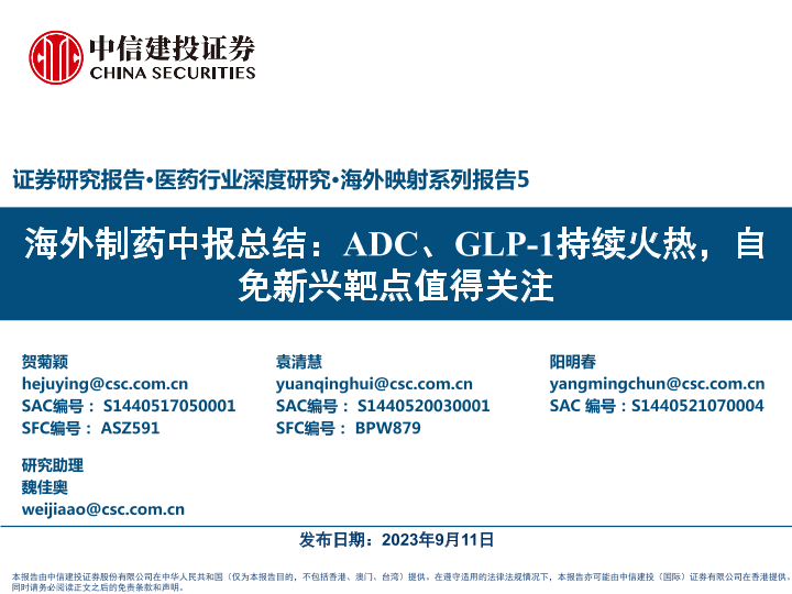 【中信建投证券】【20230911】医药行业深度研究·海外映射系列报告5:海外制药中报总结,ADC、GLP_1持续火热,自免新兴靶点值得关注-96页
