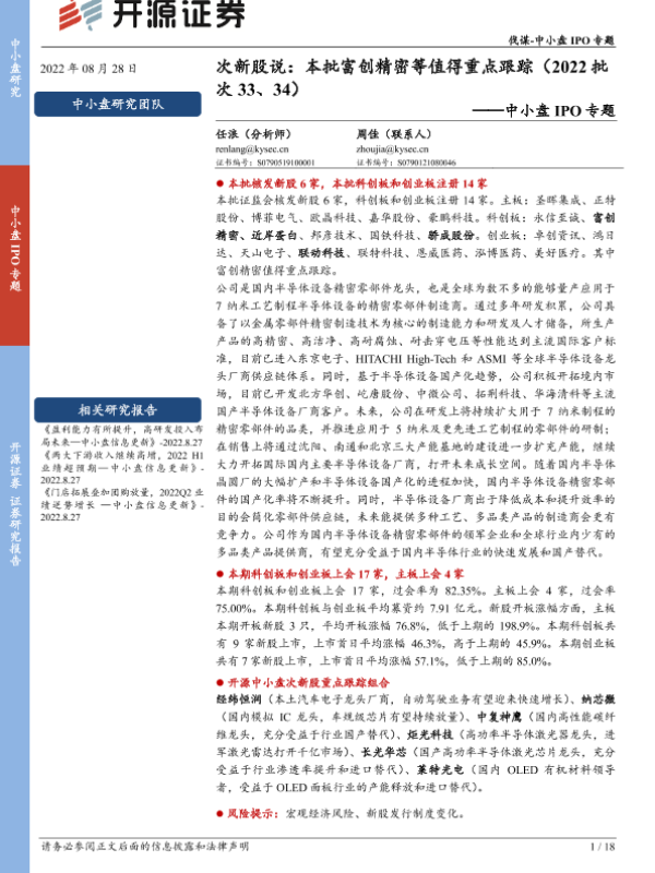 【开源证券】【20220828】中小盘IPO专题:次新股说,本批富创精密等值得重点跟踪(2022年批次33、34)-18页