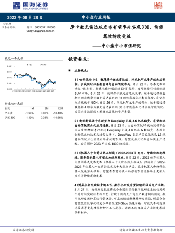 【国海证券】【20220828】中小盘中小市值研究:摩卡激光雷达版发布有望率先实现NOH,智能驾驶持续受益-21页