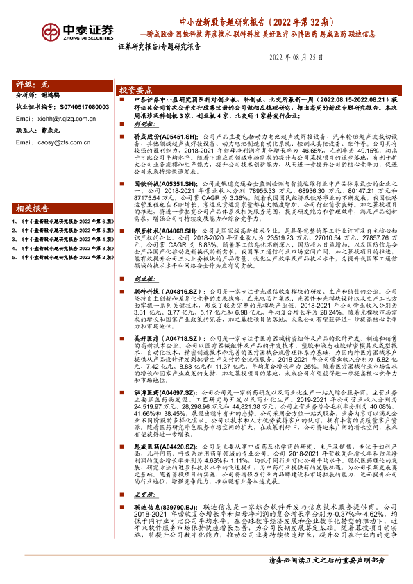 【中泰证券】【20220825】新股专题研究报告(2022年第32期):骄成股份 国铁科技 邦彦技术 联特科技 美好医疗 泓博医药 恩威医药 联迪信息-48页