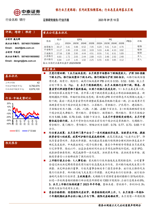 【中泰证券】【20230910】银行业月度跟踪:系列政策陆续落地;行业息差底部基本呈现-20页