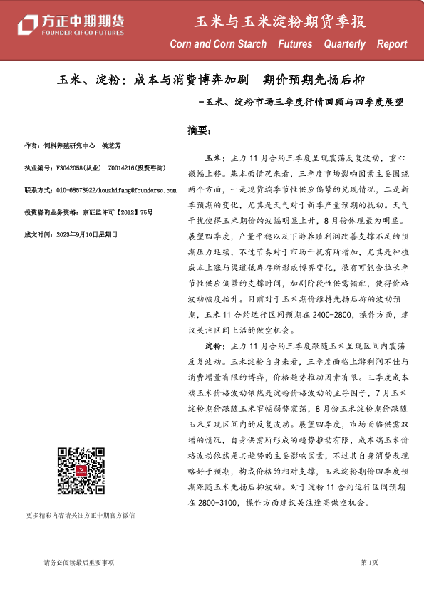 【方正中期期货】【20230910】玉米、淀粉市场三季度行情回顾与四季度展望:成本与消费博弈加剧,期价预期先扬后抑-27页