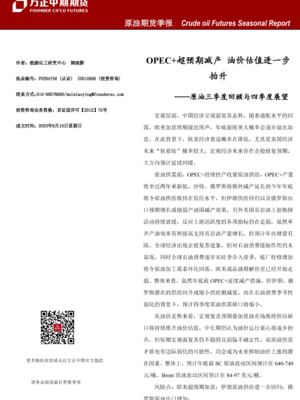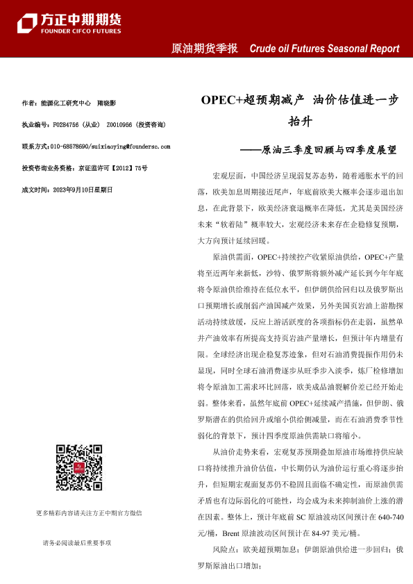 【方正中期期货】【20230910】原油三季度回顾与四季度展望:OPEC+超预期减产,油价估值进一步抬升-24页