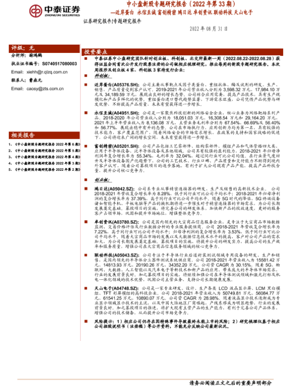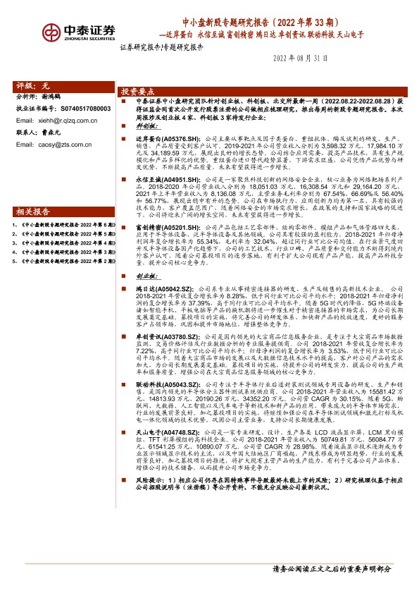 【中泰证券】【20220831】中小盘新股专题研究报告(2022年第33期):近岸蛋白,永信至诚,富创精密,鸿日达,卓创资讯,联动科技,天山电子-37页