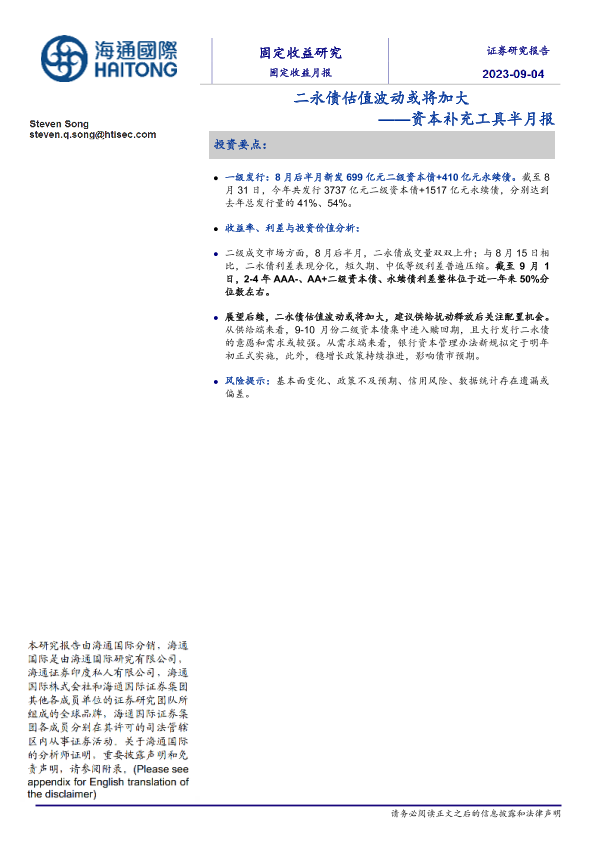 【海通国际】【20230904】二永债估值波动或将加大 ——资本补充工具半月报-18页